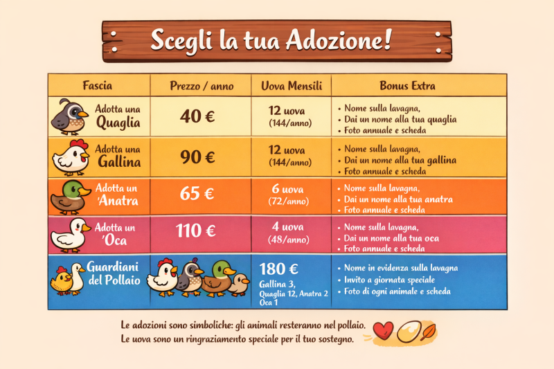 Ogni adozione contribuirà a questo progetto: più sostegno riceviamo, più bello e accogliente sarà il pollaio, e più i nostri amici piumati potranno vivere felici e sicuri.
